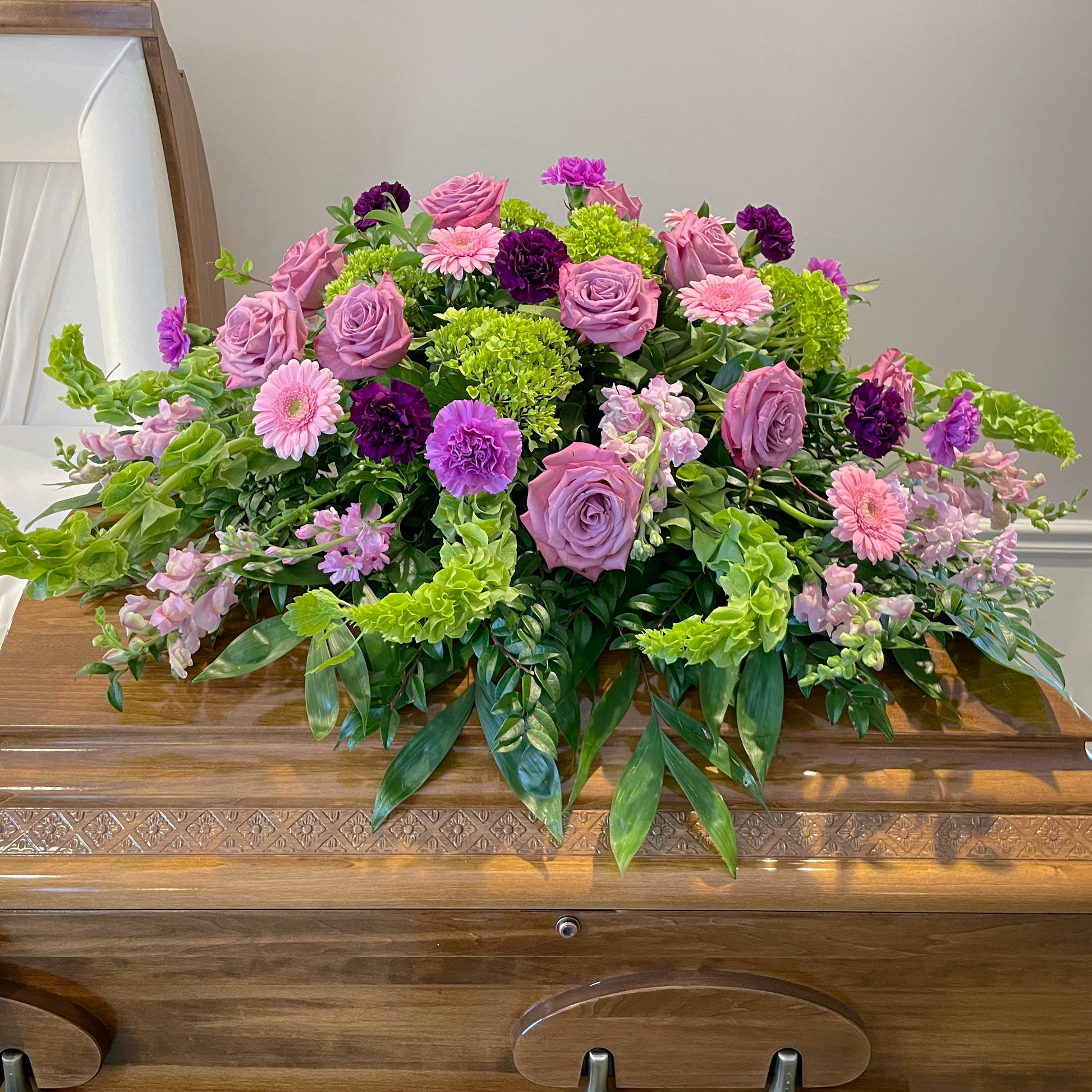 Part of the Evans 'Beautiful Memories' Collection, this exquisite casket blanket is a heartfelt tribute to a cherished life. Featuring a stunning assortment of blooms, including elegant roses, delicate hydrangeas, vibrant gerberas, and classic carnations, it is complemented by other seasonal favorites. Presented in soothing shades of purple, lavender, soft pink, and fresh green, this arrangement offers a graceful expression of love and remembrance. Thoughtfully designed, the Beautiful Memories casket blanket brings comfort and beauty during a time of reflection and honor.