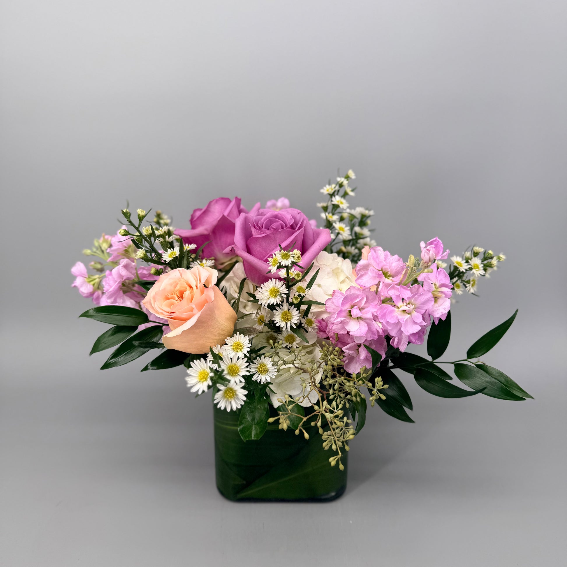Soft, romantic, and effortlessly charming, Blushing Meadow features a delicate mix of lavender and peach roses, airy pink stock, creamy hydrangea, and dainty seasonal accents, all finished with lush greenery. Designed in a modern leaf-wrapped cube, this arrangement feels light, fresh, and beautifully balanced.