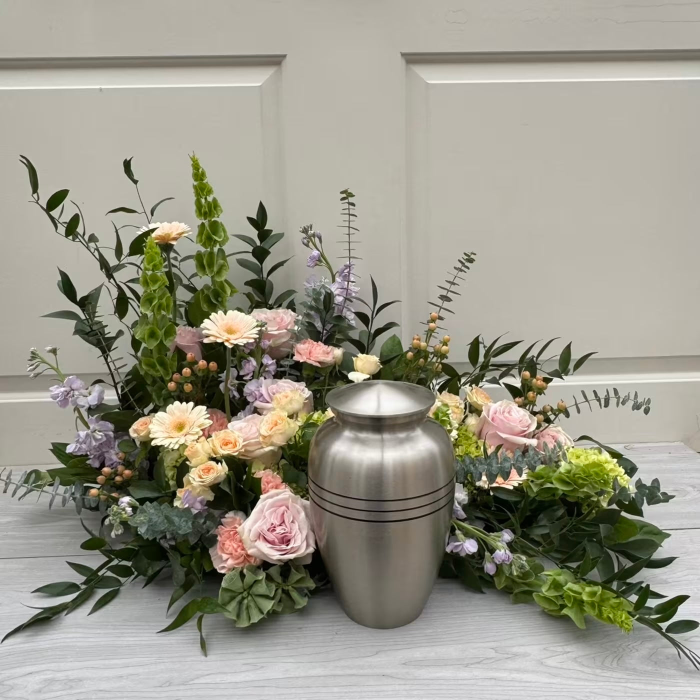 Place your loved ones urn amongst a garden of beautiful flowers. Available in any color palette this design includes a collection of beautiful blooms, naturally arranged as they grow in a garden.
