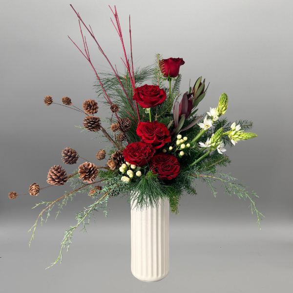 A striking minimalist take on winter florals, Evergreen Sculpture brings modern elegance and natural texture together in a tall, large, architectural design. Vibrant red roses soften the composition, while sculptural pinecones and delicate winter berries add organic movement. Red dogwood branches create clean vertical lines, giving the piece its signature artistic form. Layered evergreen varieties—including pine and fir—add depth and fragrance, rising naturally from a matte ivory ribbed vase that enhances the design’s sleek silhouette.