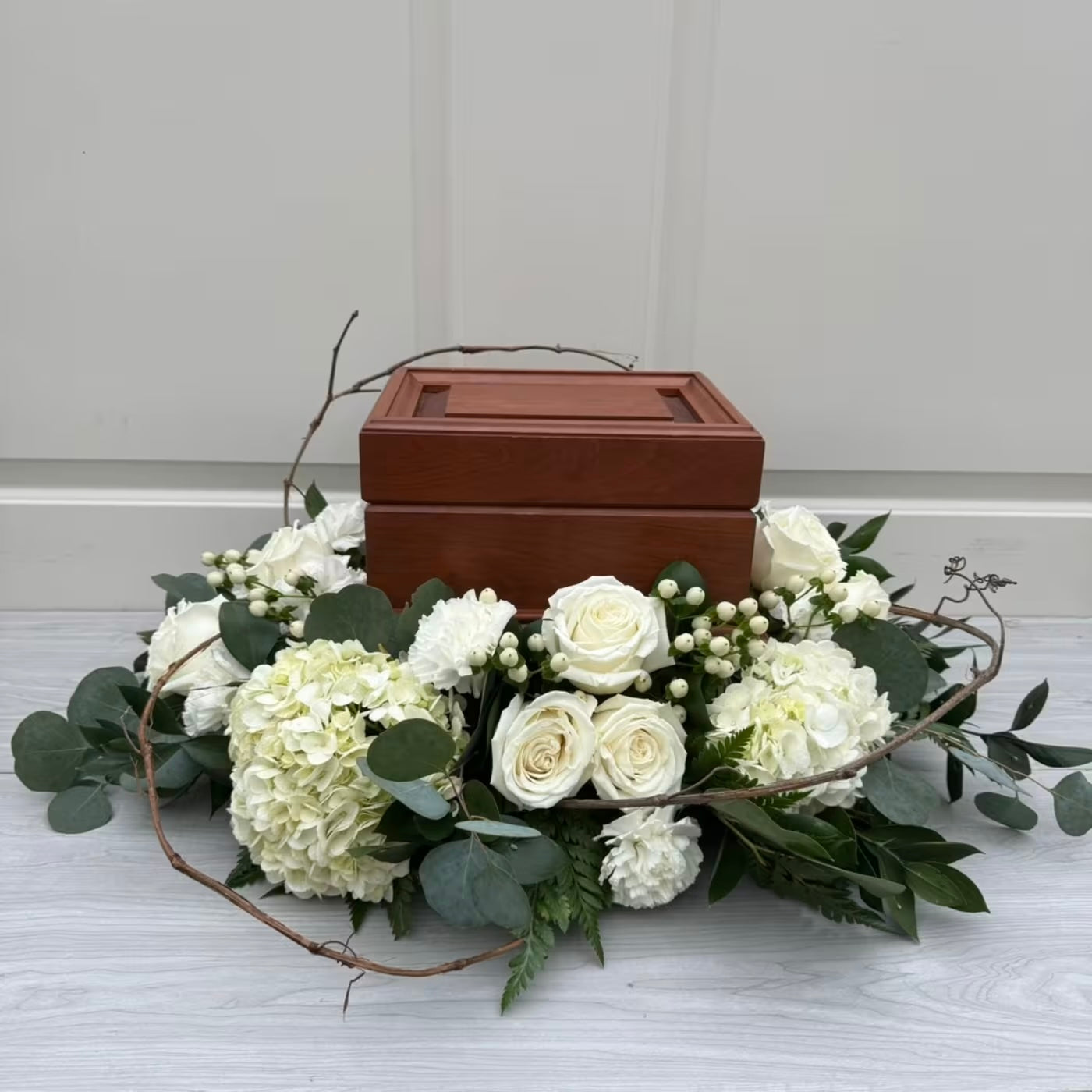 This design creates a lovely pillow to hold your loved one's cremation container. Available in any color palette, this custom design will display any size container beautifully.