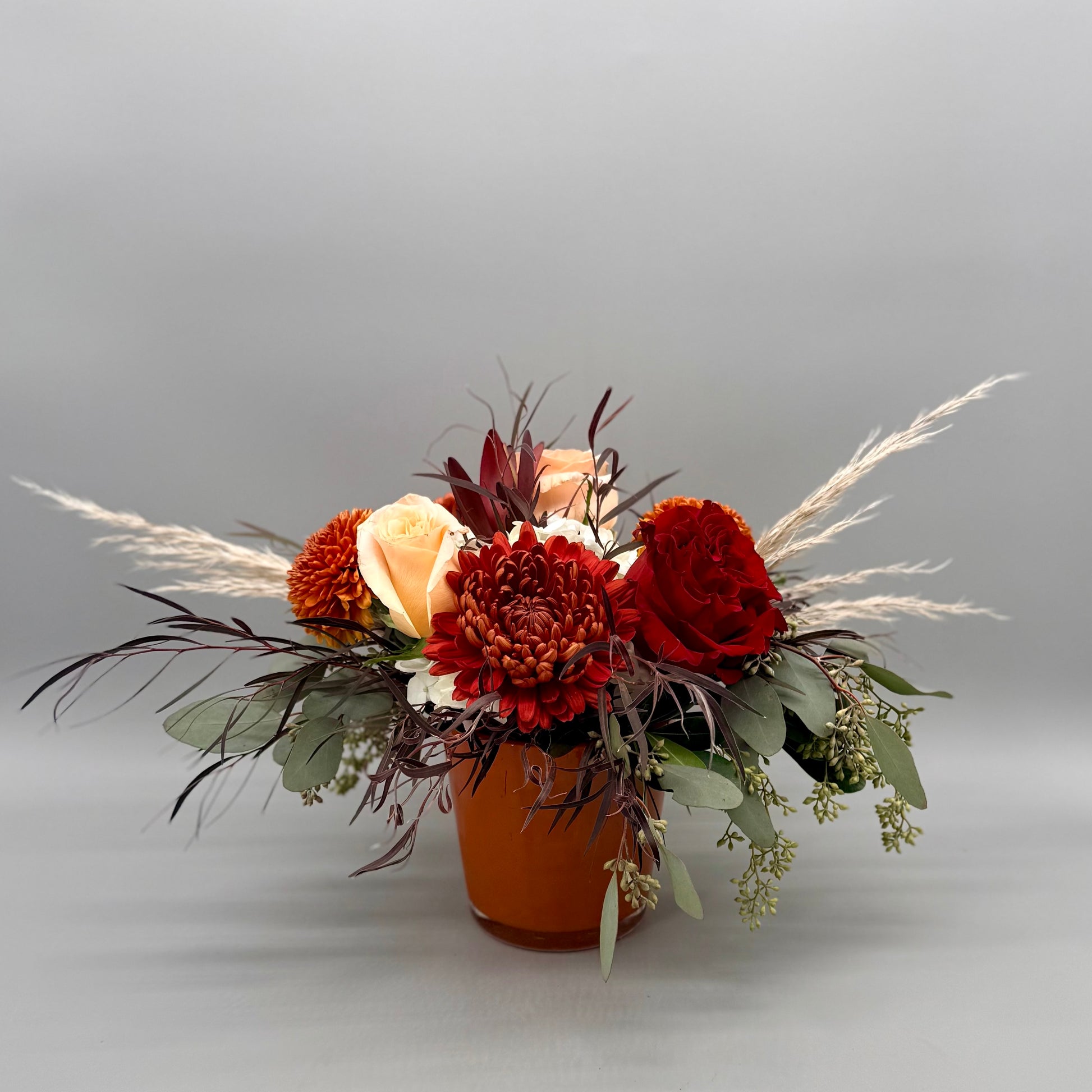 Bring warmth and richness to your Thanksgiving celebration with this handcrafted fall centerpiece. Featuring red chrysanthemums, deep red roses, peach roses, pampas grass, and layered eucalyptus, it captures the texture and glow of the season. Designed in a warm orange vase, it’s ideal for holiday tables, hosting gifts, and fall home décor. Perfect for Thanksgiving dinner, Friendsgiving, or any autumn gathering on the North Shore.