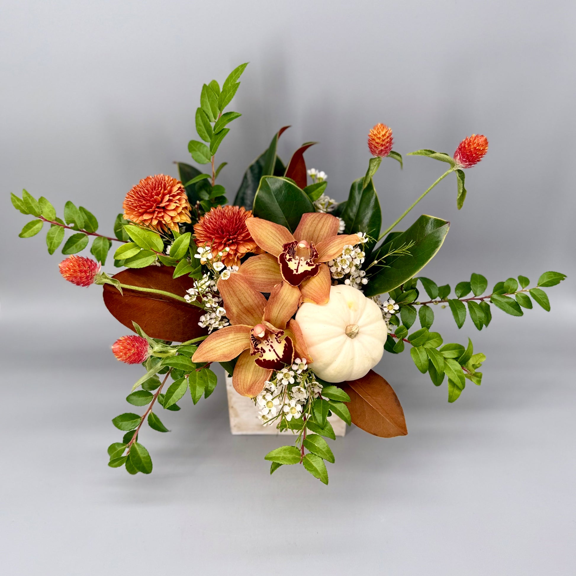 Cozy, charming, and full of fall flair—Pumpkin Spice & Everything Nice is a seasonal favorite. This playful design features burnt-orange cymbidium orchids, rust-toned mums, and cheerful orange gomphrena, all accented with delicate waxflower and lush greenery. A whimsical mini white pumpkin is tucked in, making it the perfect nod to the harvest season.