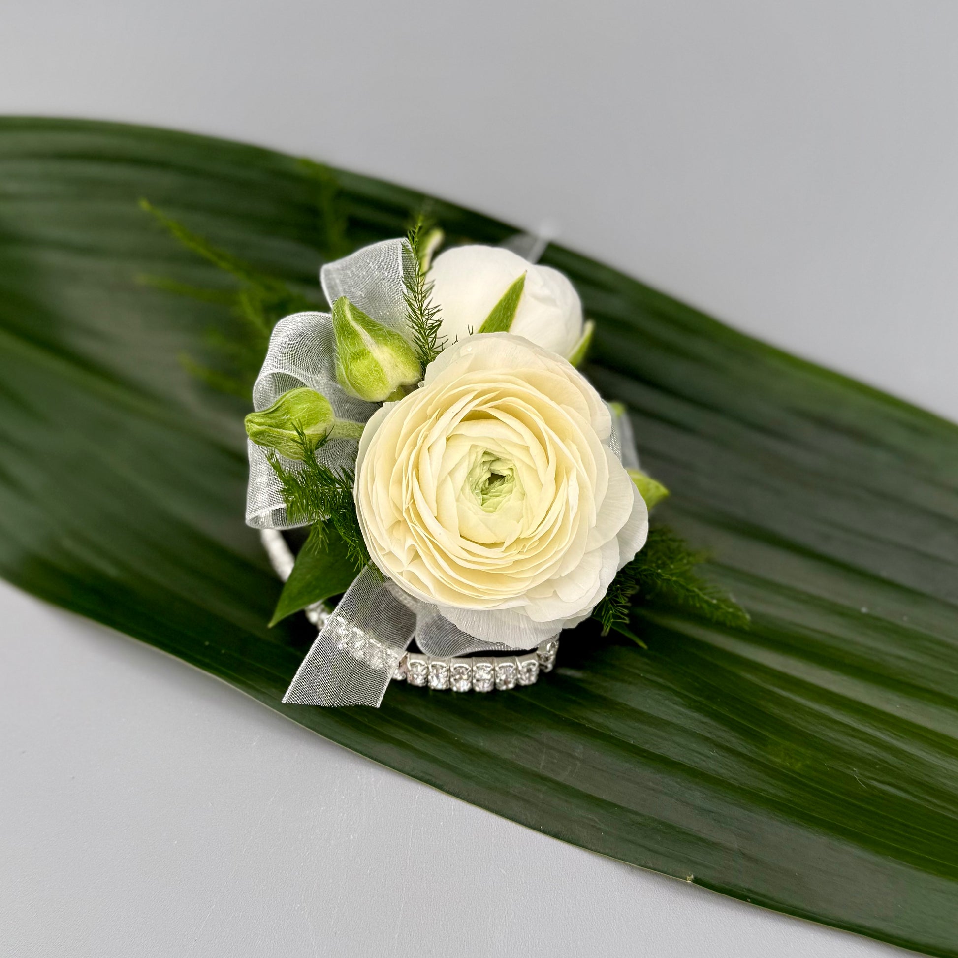 Add a touch of sophistication to your prom night with our exquisite White Ranunculus Corsage. Featuring delicate, layered white ranunculus blooms on a rhinestone bracelet, this corsage is the perfect blend of classic beauty and modern elegance.