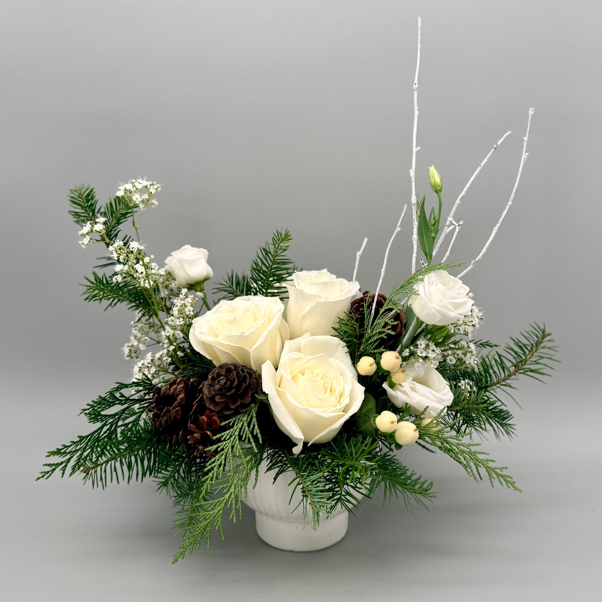 A serene and sophisticated winter design, Snowfall & Evergreens evokes the quiet beauty of freshly fallen snow. Elegant ivory roses take center stage, surrounded by soft white blooms and seasonal evergreens for a natural, woodland feel. Textured pinecones add a rustic winter touch, while frosted white branches rise gracefully, bringing height and a hint of icy sparkle. Cream hypericum berries and delicate filler flowers complete the palette with subtle warmth.