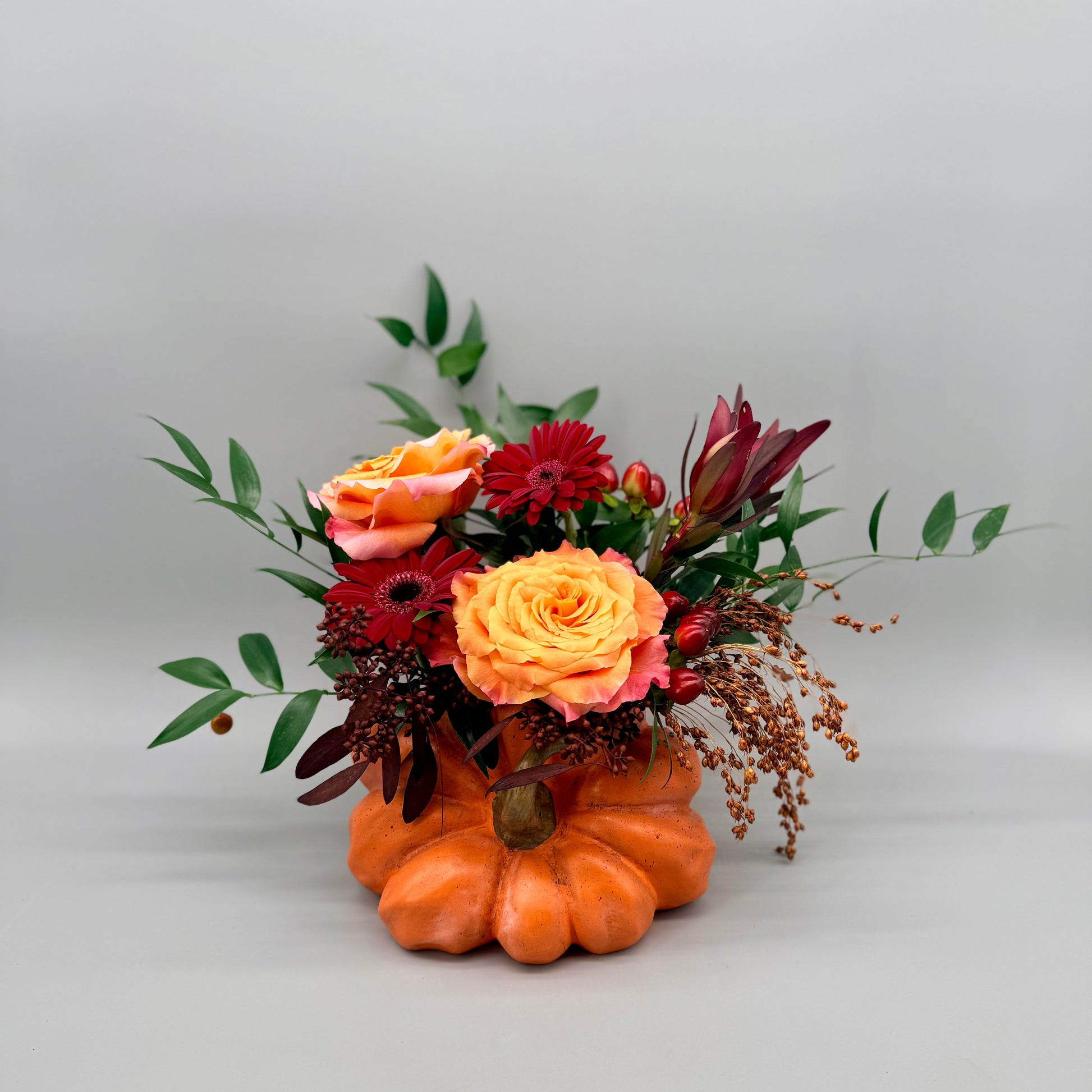 Celebrate the season with this handcrafted Thanksgiving arrangement designed in a charming pumpkin-shaped vase. Featuring vibrant orange roses, deep red mums, seasonal berries, and fresh greenery, this centerpiece captures the warmth and color of autumn. Its compact size makes it perfect for Thanksgiving dinner tables, kitchen islands, sideboards, and holiday gifting throughout the North Shore. A festive and long-lasting way to bring fall charm into any home or gathering.
