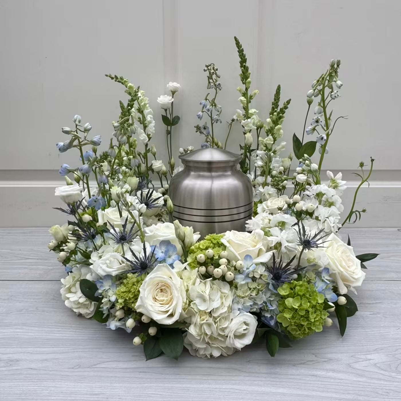 Shades of white, blue and green blooms including hydrangea, roses, delphinium and more all gracefully designed into a round wreath making this a beautiful memorial for your loved one. Perfect for an urn or smaller cremation container.